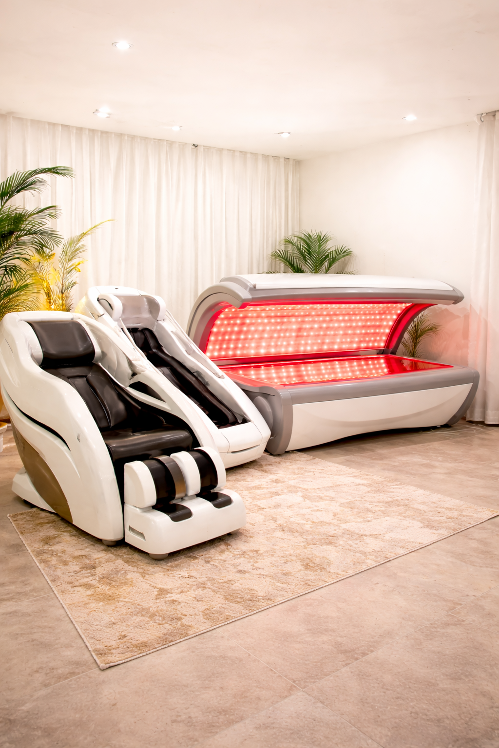 Our curated wellness therapies include Grounding Acoustics, Infrared Sauna, Halotherapy, HydroHeal hydrogen therapy, and Power Plate vibration—working together to promote relaxation, cellular health, and full-body rejuvenation.